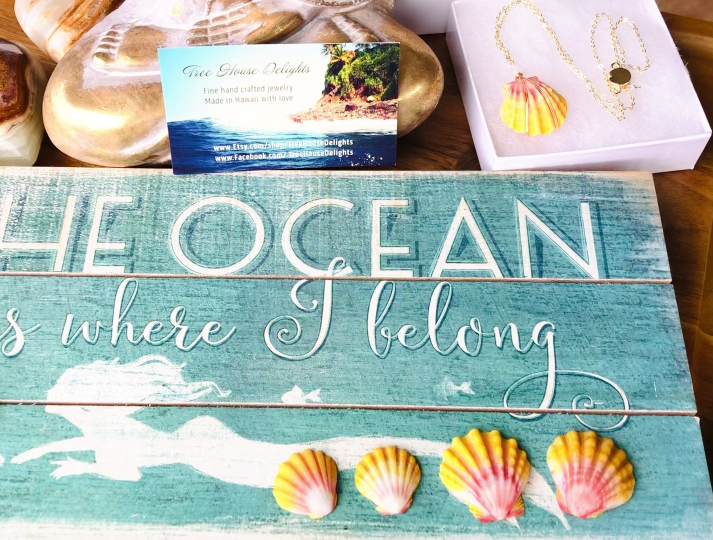 Get your Sunrise Shell necklace today and you will be wearing an exclusive, one of a kind piece, made with Aloha in a treehouse in Hawaii!