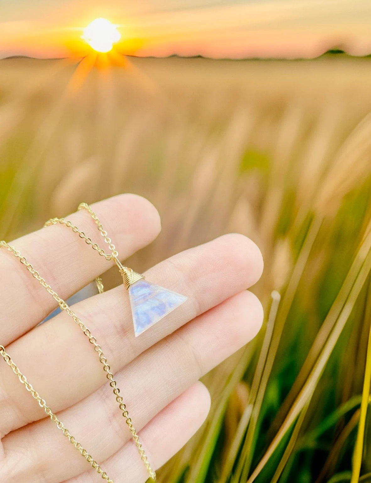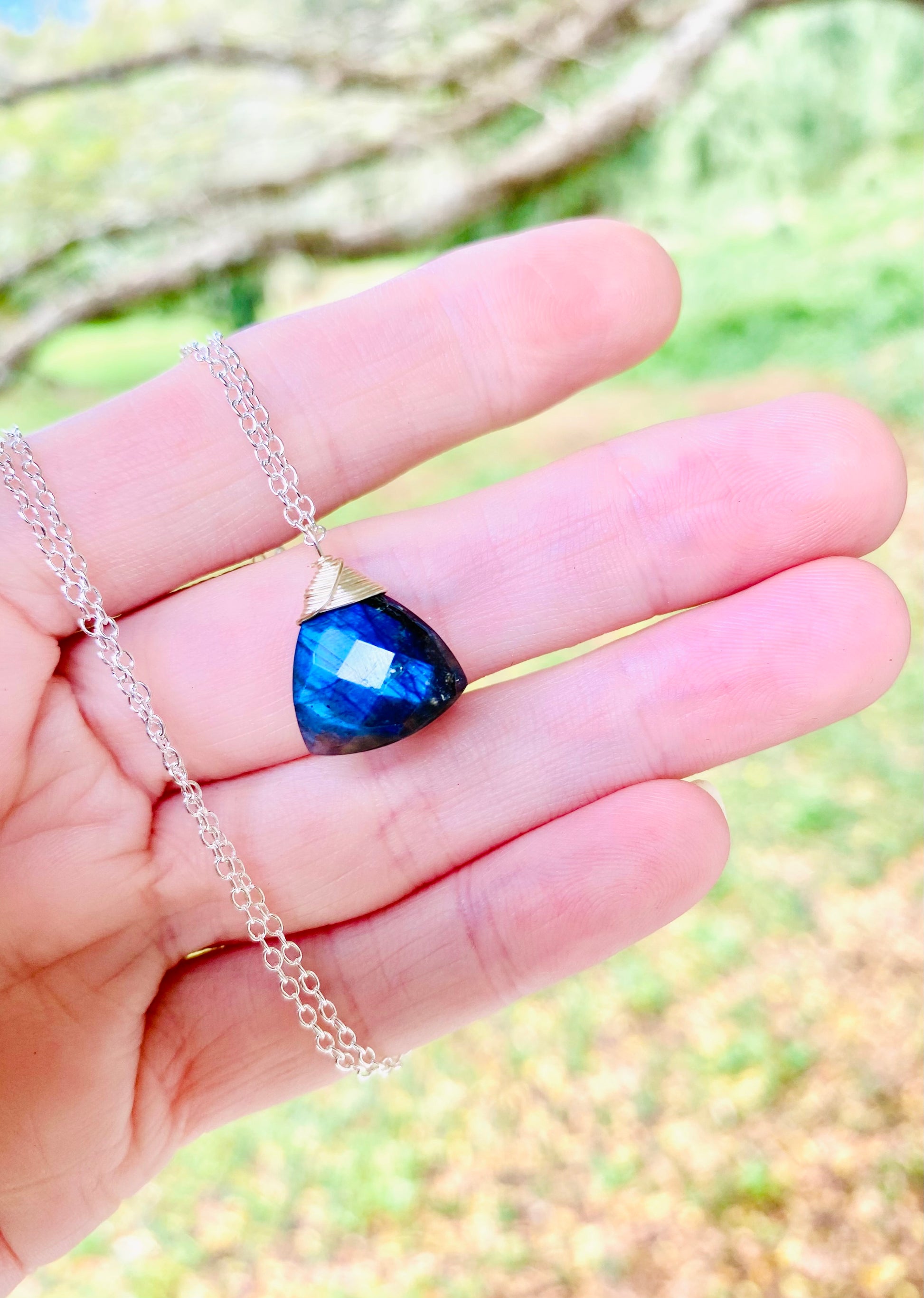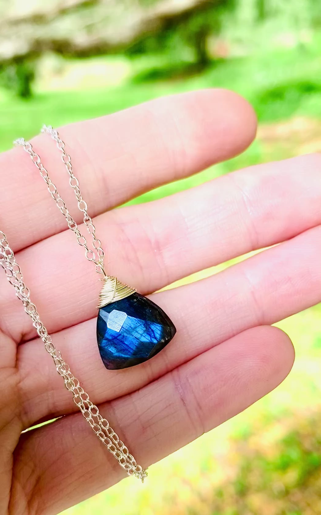 These Beautiful and truly unique necklaces are lovingly handmade with GORGEOUS, GLOWING and AMAZING, triangle shaped, AAA grade Labradorite gemstones! They will be lovingly wire wrapped in sterling silver or 24K gold fill wire and hung on a petite and sweet flat cable chain. The silver elements can be oxidized for the rustic antique look you see on image one. I only have a few of these INCREDIBLE gemstones so this is a very limited edition piece. They are a shop favorite and are going fast. Each gemstone is 100% natural and hand cut so they all differ slightly in color and shape but all truly stunning and one of a kind gemstones. They are all AAA quality and have that strong deep blue flash quality that is so beautiful, amazing and rare! Love them so much! Matching earrings available to special order and these are also available with a rounder shape (as shown on the last few images). I also sell a Rainbow Moonstone version of this one!🌕✨