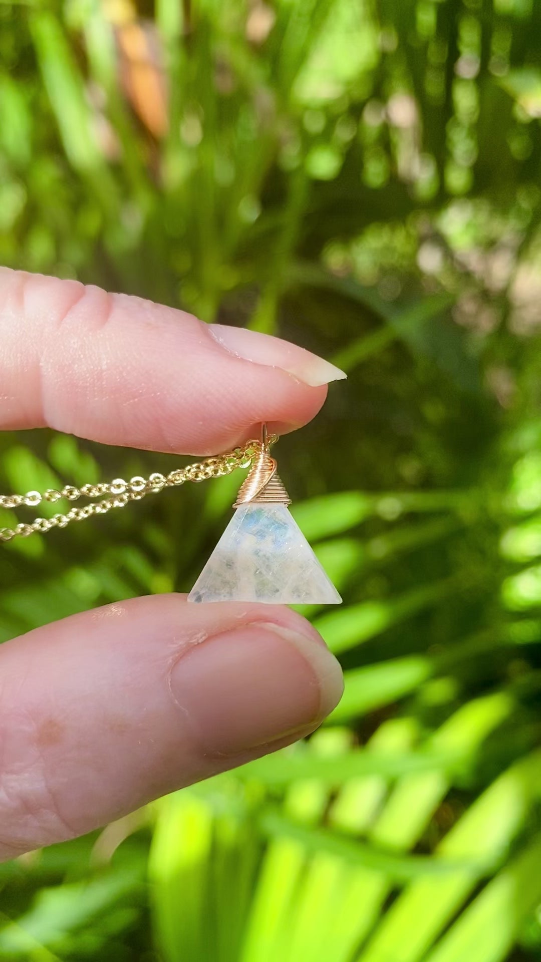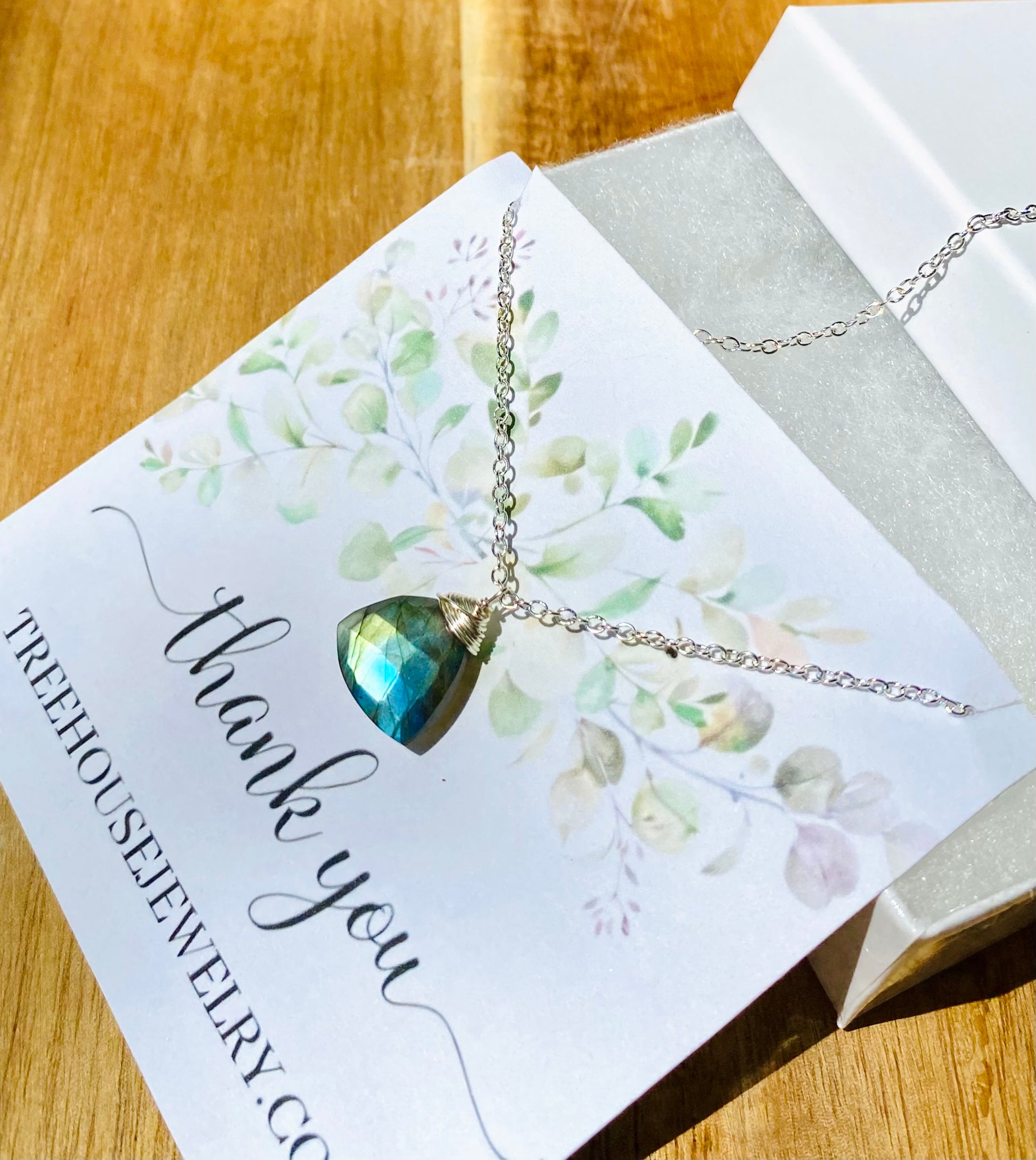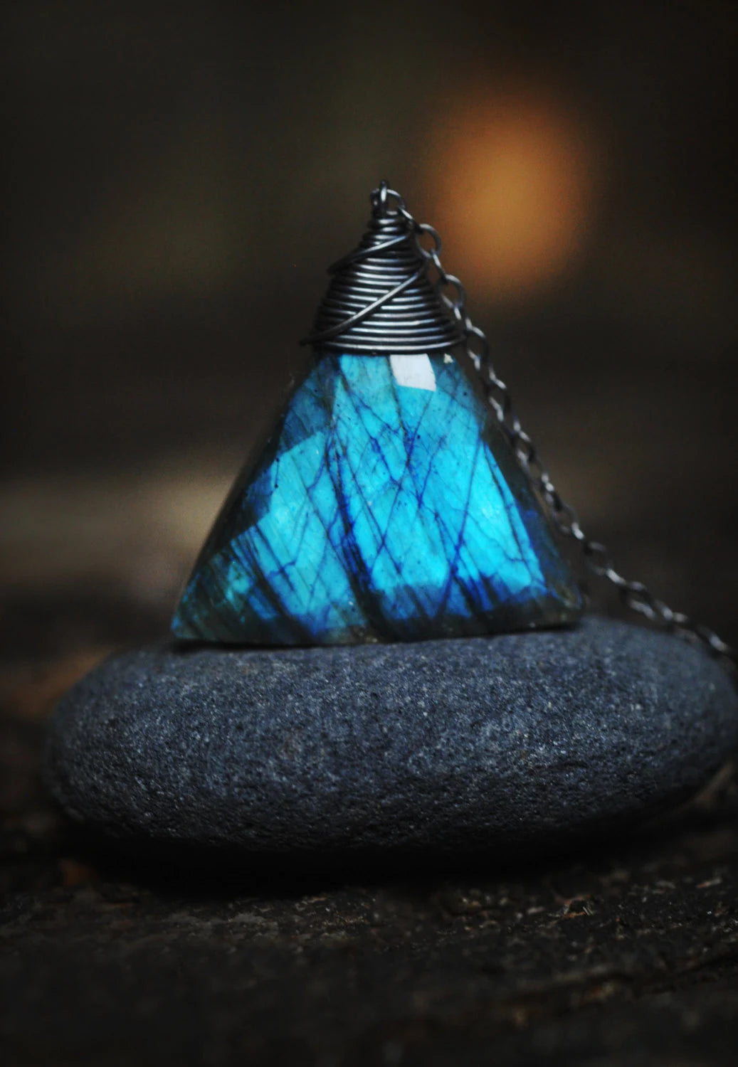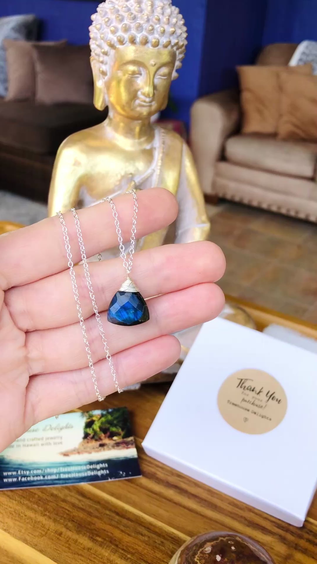 These Beautiful and truly unique necklaces are lovingly handmade with GORGEOUS, GLOWING and AMAZING, triangle shaped, AAA grade Labradorite gemstones! They will be lovingly wire wrapped in sterling silver or 24K gold fill wire and hung on a petite and sweet flat cable chain. The silver elements can be oxidized for the rustic antique look you see on image one. I only have a few of these INCREDIBLE gemstones so this is a very limited edition piece. They are a shop favorite and are going fast. Each gemstone is 100% natural and hand cut so they all differ slightly in color and shape but all truly stunning and one of a kind gemstones. They are all AAA quality and have that strong deep blue flash quality that is so beautiful, amazing and rare! Love them so much! Matching earrings available to special order and these are also available with a rounder shape (as shown on the last few images). I also sell a Rainbow Moonstone version of this one!🌕✨